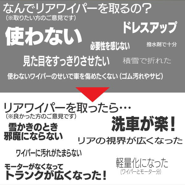 あす楽,DIY,カーパーツ,カー用品,社外,カスタム,カスタマイズ,ドレスアップ,リアビュー,リアワイパー,ワイパーレスキット商品詳細 リアワイパーレスキット あまり使用されることのないリアワイパー これを取り外して出来た穴にこのワイパーレスキットを装着することで リアビューがすっきりします! 取り付けは、まず内貼りを剥がし、リアワイパーを外し、 ワイパーモーターを外してワイパーレスキットを取り付けるだけ! もちろん水をかけても内側に染み込むことはありません! ゴムワッシャーがボディーに当たる場合は、当たる部分をカッターでカットをお願い致します。